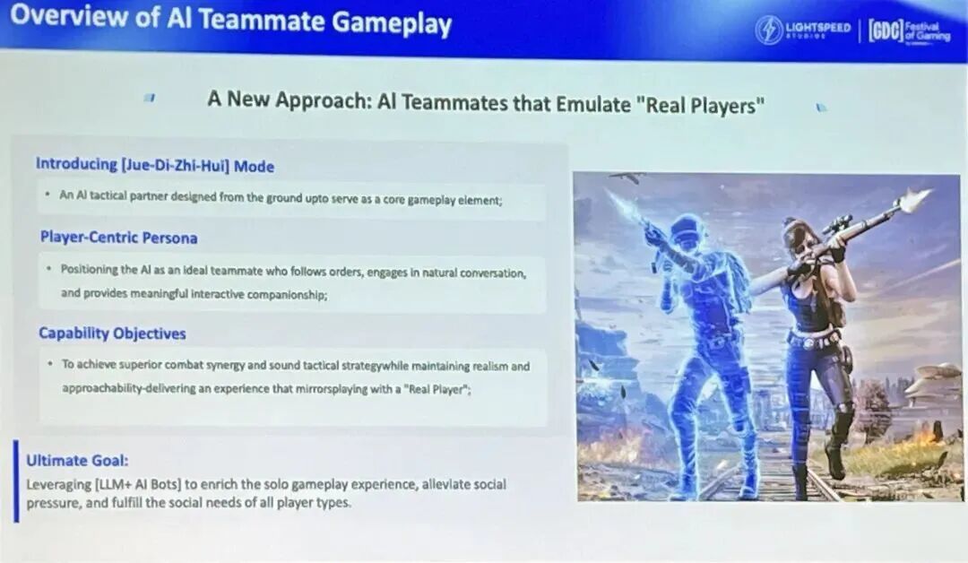 但事实上,游戏长线运营生态里的出现的种种核心顽疾,如今都能够通过AI技术解决。在GDC现场,光子《和平精英》策划副总监薛冰抛出了一个观察:在高度强调组队配合的战术竞技游戏里,依然有超过半数(约59%)的玩家选择纯单排。原因是,匹配机制做得再好,也治不好“怕坑队友、不敢开麦”的社交恐惧症,这直接影响到了这部分隐性核心用户的留存。