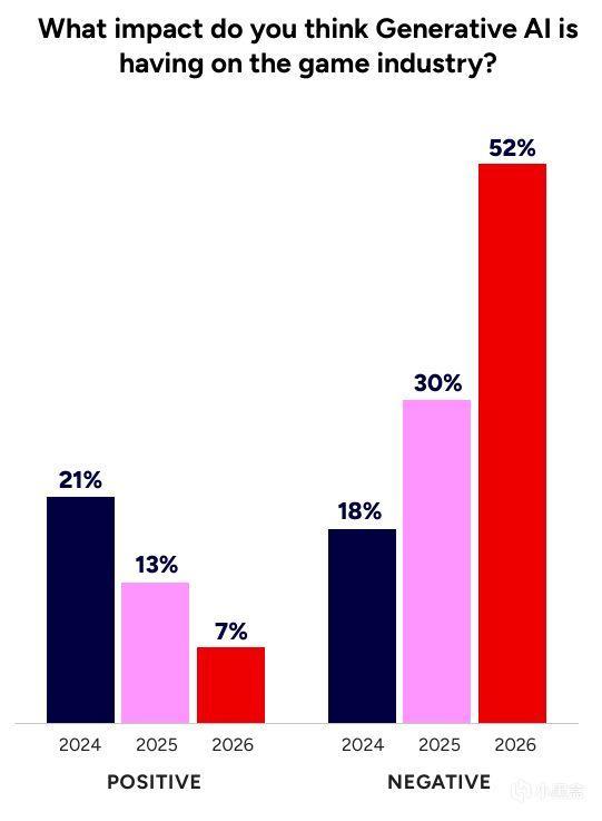 GDC官方在会前发布的《2026游戏行业现状报告》显示,海外开发者群体对生成式AI等新技术的态度其实非常复杂。有高达52%的受访开发者认为其对游戏行业产生了负面影响,仅有极少数人持完全积极的态度。