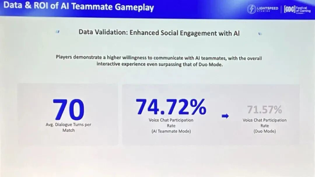震慑住海外同行的,还有随之披露的实战数据:引入该模式后,最抗拒社交的单排玩家,在AI队友模式中的占比跃升至76%,AI NPC 相关玩法的最高日活跃玩家数达到了1770万。更夸张的是,玩家平均一局会与AI进行70轮对话,开麦交流率也达到了史无前例的近75%。