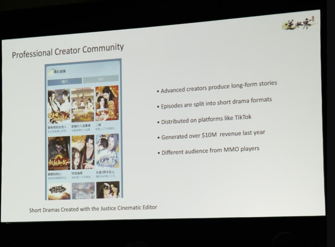 配合端内类似短视频的“剧组站”,以及敏捷捕捉外部社交媒体热梗的自动加权推送机制,团队以极低的人均成本,成功将《逆水寒》手游的MMO玩家转化为了3D短视频创作者。最终,“剧组模式”相关内容在外部短视频平台卷出了超百亿的总播放量,部分玩家自制短剧更是在一年内创造了超过1亿元人民币的实际收益。